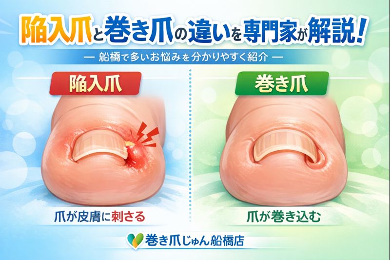 船橋で多い巻き爪と陥入爪の違いを、船橋店の専門家が分かりやすく解説。痛みの出方や原因、自己処理の危険性、正しい対処方法まで詳しく紹介します。巻き爪や陥入爪でお悩みの方は必見です。