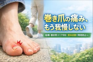 船橋店にも、「最初は切れないだけだったのに、気づいたら巻き爪で歩くのもつらくなった」という方が多く来院されています。