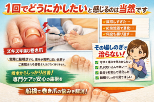 巻き爪の相談は勇気が必要です。痛み、費用、期間、再発、施術内容など不安を感じるのは当然です。しかし実際には相談後に「もっと早く来ればよかった」と言われる方が非常に多くいらっしゃいます。巻き爪じゅん船橋店では初回相談は不安を解消する時間と考えています。無理な施術提案はせず、状態説明と選択肢の提示を重視しています。巻き爪で悩む期間が長いほど歩行や姿勢、活動量にも影響が広がります。不安がある方こそまずは状態確認だけでも大丈夫です。正しい情報を知ることで安心して判断できます。